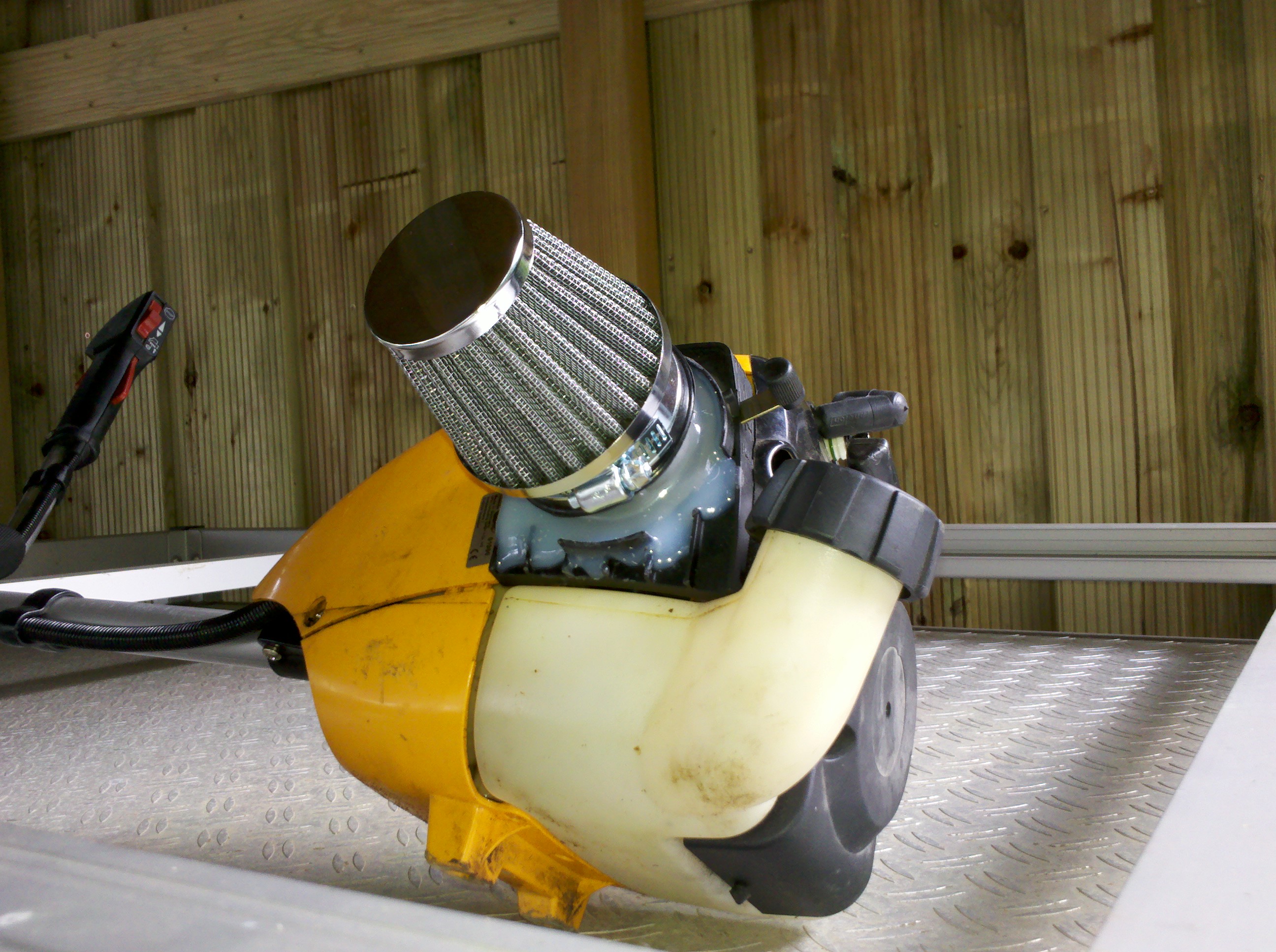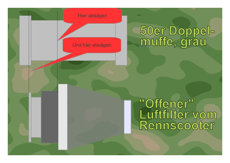 Also mal nachgemessen und siehe da, ein Selbstbauansaugstutzen sollte 50mm Innendurchmesser besitzen. Wie zum Beispiel graue Doppelmuffen! Über eBay fand sich auch schnell ein Luftfilter (Luftfilter chrom Anschlußweite 54-56 für Koso Vergaser), welcher von Jugendlichen zum Tuning ihrer Scooter benutzt wird. Kostenpunkt: rund 15 Euro inklusive Porto.