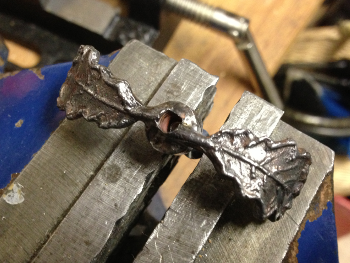 Also Plan B. Aus einem Zinnrest der Ablauflöcher habe ich eine Scheibe abgesägt, in der Mitte ein Gewinde gebohrt und zwei kleine Eichenblätter angelötet.