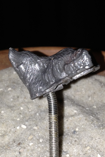 Nun kann man von vorn leider das Loch des Messingrings und später die Schraube sehen, aber dafür haben wir ja eingangs das Haupt gegossen!