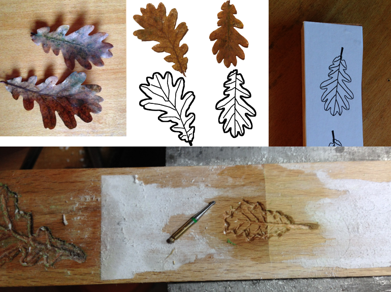 Und diesmal wollte ich Formen aus Buchenholz bauen, in welche ich die Fimo-Matsche eingepresse und ich viele schöne Positivformen produzieren kann. Dazu nehme man zunächst ein paar Blätter, diese werden abfotografiert und im Gimp freigestellt. Der verbliebene Rest des Bildes wird vom Programm umrandet und es müssen nur noch die Blattrippen gezeichnet werden: Die Konturen habe ich dann herausgeproxxont, der Proxxonschleifer ist nämlich um Klassen besser als der Dämel.