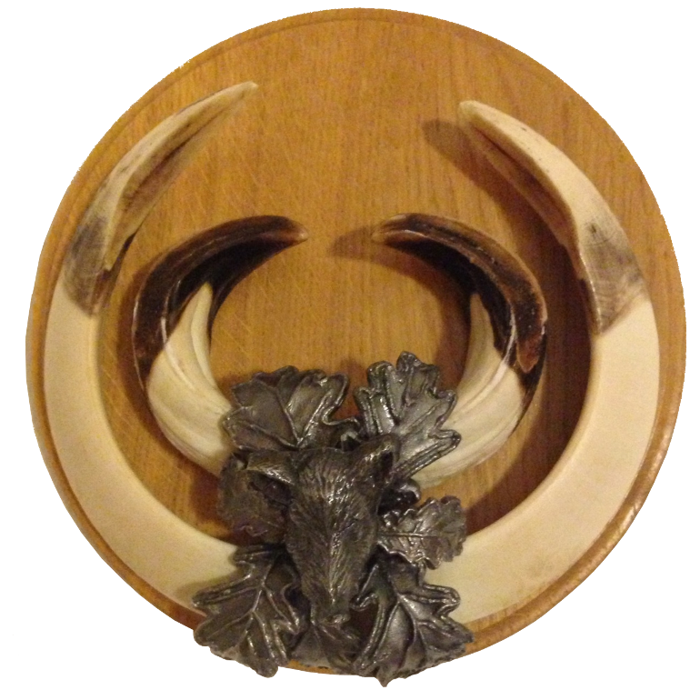 Das Gewaff meines letzten Keilers wollte ich gern ansprechend präsentieren und stöberte dazu im Internet herum. Schnell war klar, dass nur zwei Lösungen in Betracht kamen, entweder ein geschnitztes Brettchen oder ein rundes Brettchen mit Zinn-Abdeckern.
