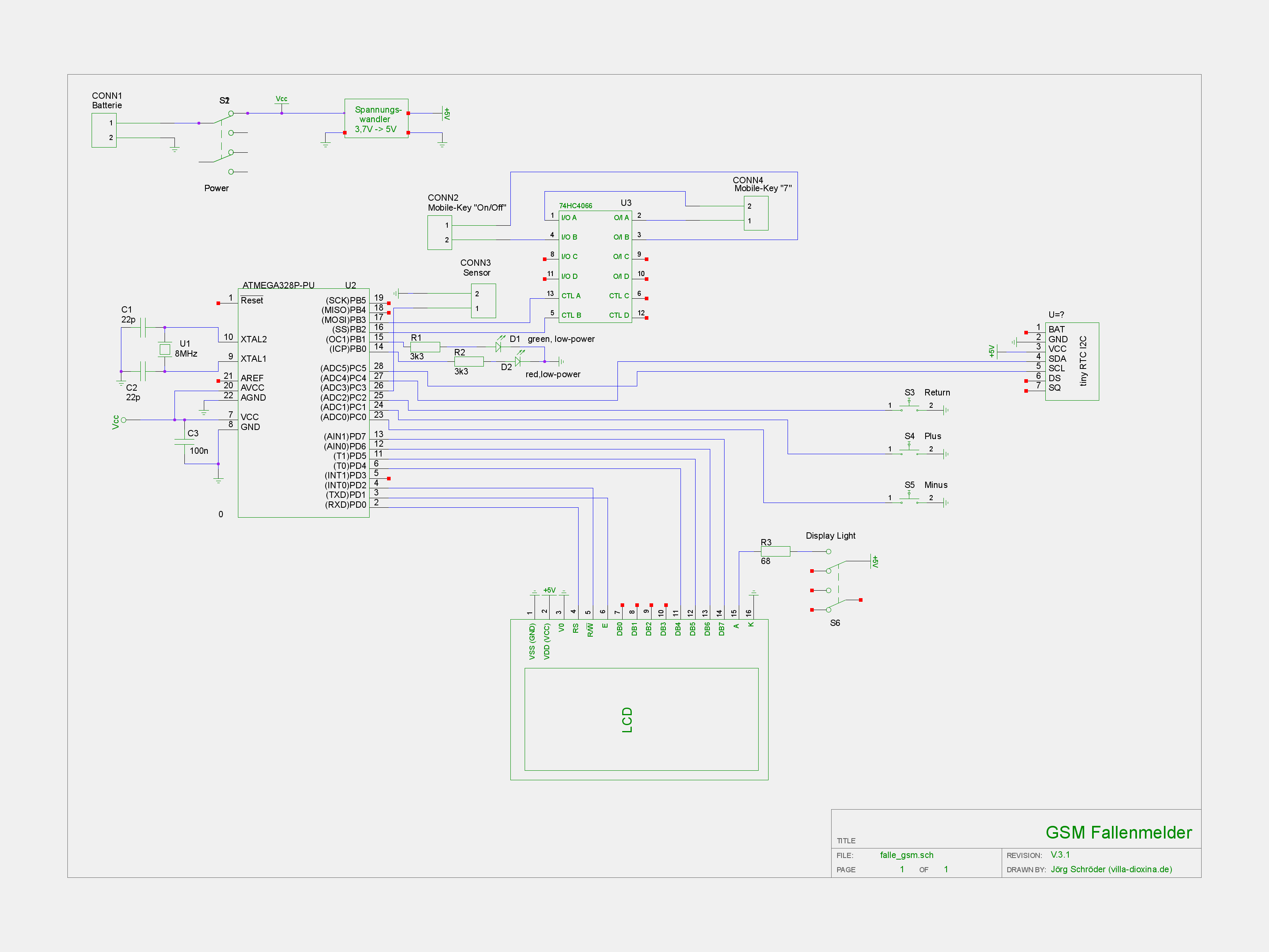 Der GSM Fallenmelder in der alten Fassung wurde und wird vorsichtig weiterentwickelt. In der aktuellen Version ist das Handling mit Uhr, Meldezeiten und Auswahl des Sensors deutlich verbessert.