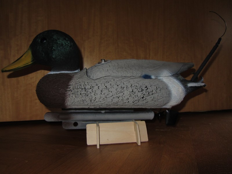 Nun hieß es, die Antenne unterzubringen. Wie eingangs erwähnt, sollte sie im Entenschädel versteckt werden, aber da der Motor schon ziemlich in das Vorderteil hineinragt und man dort nicht mehr herankommt, bohrte ich ein Loch in das Bürzel der Ente und setzte dort ein Stück des Heckrohres des Hubschraubers ein. Die Antennenlitze wird durch ein Loch im Rohr, knapp über dem Entenkörper, herausgeführt und auf dem Röhrchen aufgewickelt.
