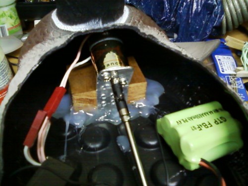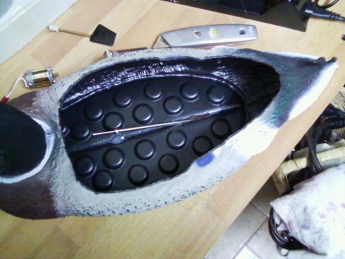 Zunächst machte ich mal ein paar Gedanken, wie die Ente hinterher aussehen sollte, Antrieb und Steuerung sollten möglichst nicht zu sehen sein, deshalb plante ich, die Antenne im Kopf der Ente zu verstecken, aber nachdem der zunächst so üppige Platz im Entenrumpf zusehends schrumpfte, verwarf ich diesen Einfall und baute eine Wendelantenne aus der Antennenlitze, dem Rest des Heckrohres und etwas Schrumpfschlauch. Aber dazu später mehr.
