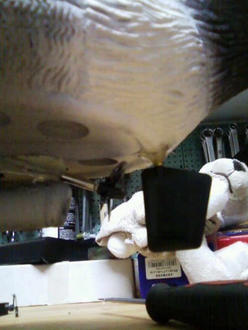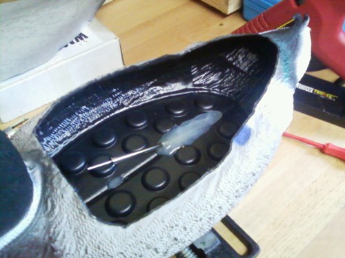 Zuerst habe ich den Entenkörper mit einem Teppichmesser unterhalb der Flügel aufgeschnitten und die Flügel beiseite gelegt. Dann scheiterte der erste Versuch, ein halbwegs passendes Loch für das Stevenrohr zu bohren, das Kunststoffmaterial der Ente ist im Kiel sehr viel stärker als an den Seiten.