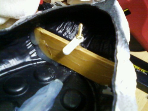 Zum Einbau des Ruders reicht leider ein simpler Schlitz im Rumpf nicht aus, ich bohrte ein Loch, fixierte das Rohr in ausgerichteter Stellung und fertigte mir dann eine Schablone für ein Brettchen an, welches das Ruder später tragen sollte.